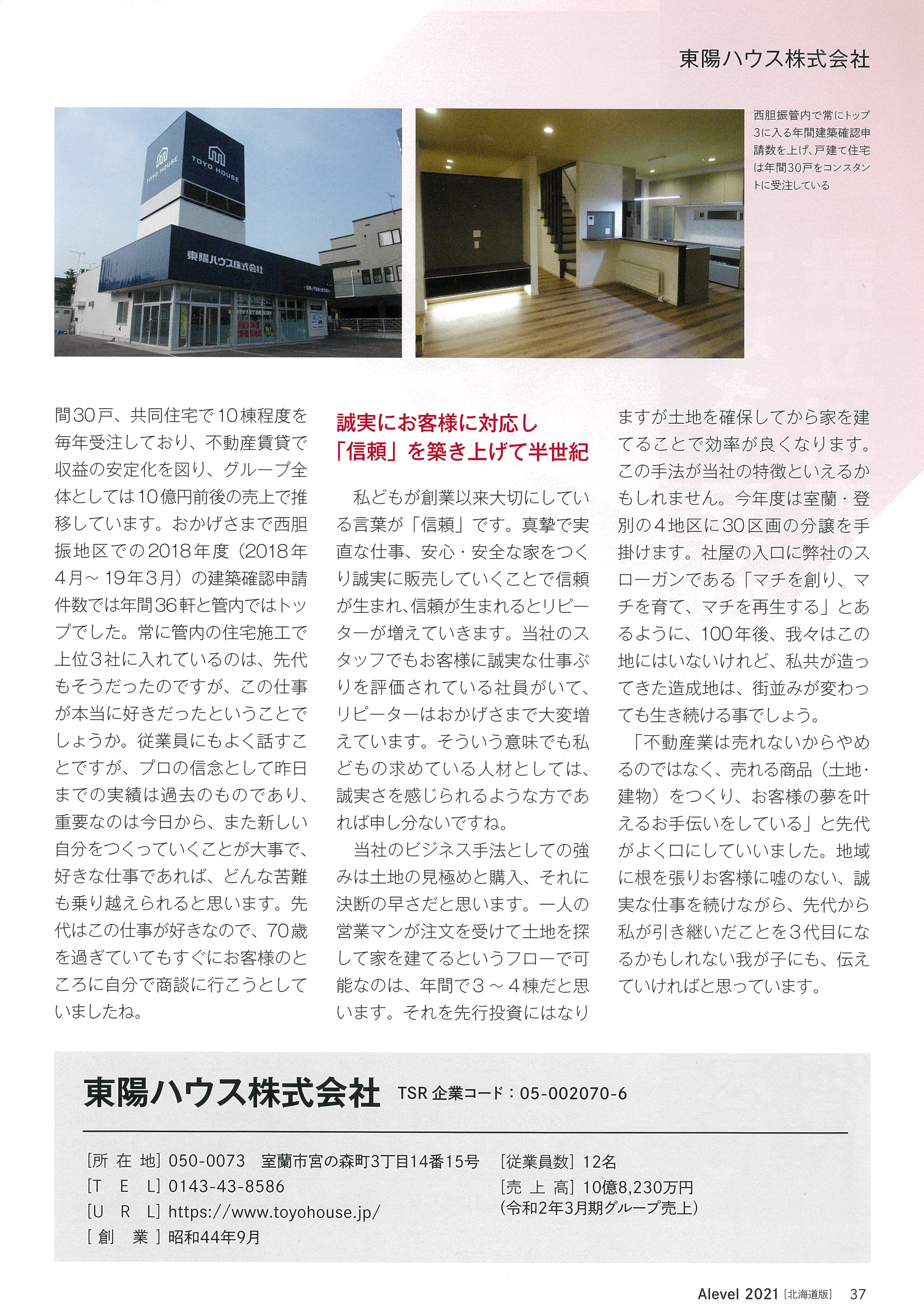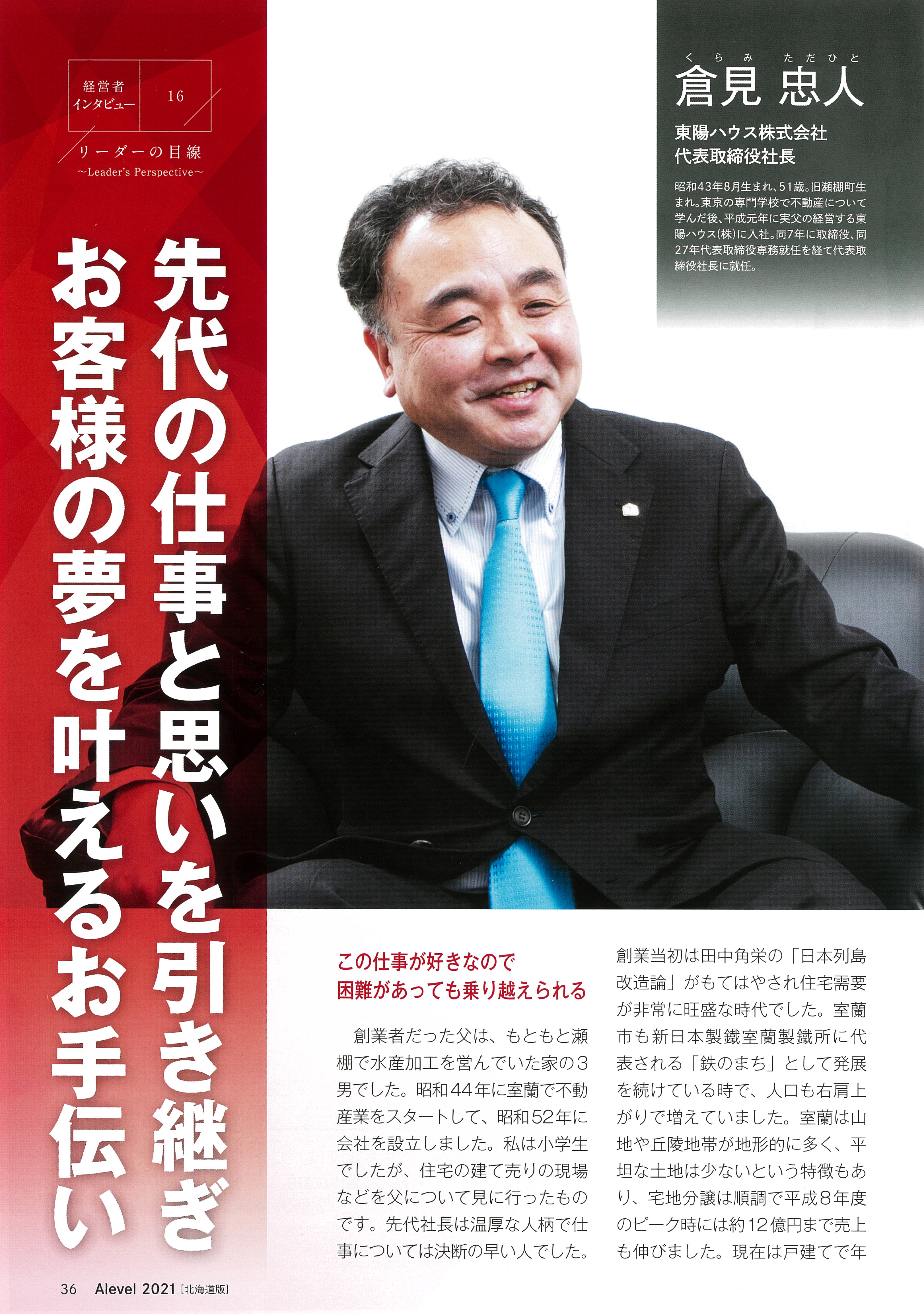 株式会社東京商工リサーチ発行のAlevel(エラベル)2021 北海道の「優良企業」経営者インタビューに、 弊社代表取締役の倉見の取材記事が掲載されました。